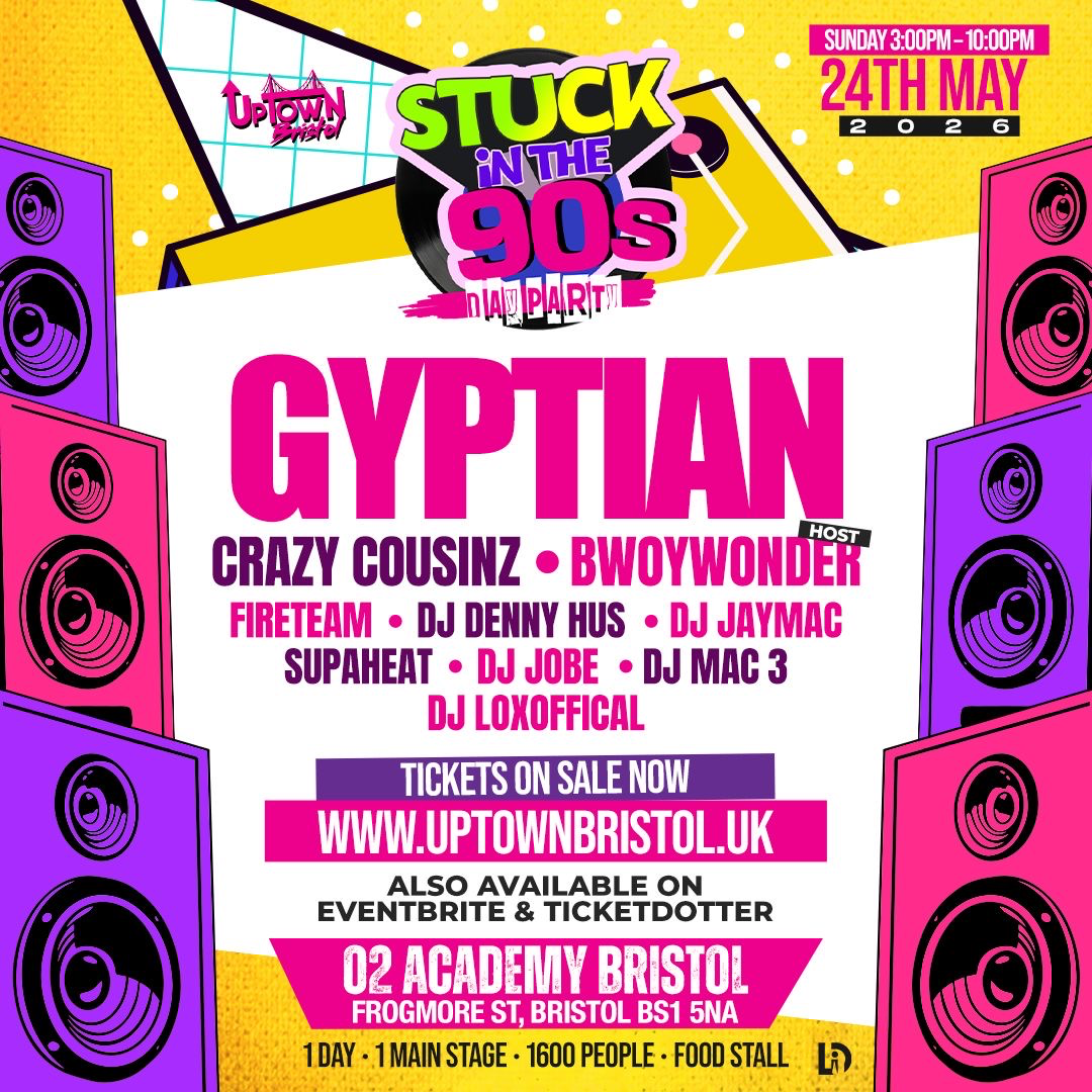The EventSTUCK IN THE 90s – DAY PARTY ☀️🔥Bristol’s ultimate throwback day party returns this May!All your favourite old-school anthems in one place, from the 90s right through to the 2010s.Let’s take a trip down memory lane 🎶✨🗓 Sunday 24th May 2026⏰ 3:00PM – 10:00PM📍 O2 Academy BristolFrogmore St, Bristol BS1 5NA🎶 Nostalgic R&B, Hip Hop, Dancehall, Reggae, Funky House & Garage🎤 LIVE PERFORMANCE BY: REGGAE SUPERSTAR GYPTIAN 🤯🎧 Special Dj Set By: Crazy CousinzMusic by: Fireteam, Dj Denny Hus, Supaheat, Dj jay Mac, Dj jobe, Dj loxofficial, Dj Mac 3 Hosted by: BwoyWonder✨ 1 Day✨ 1 Main Stage✨ 1600 People✨ Food Stall🎟 Tickets available now🌐 www.uptownbristol.uk