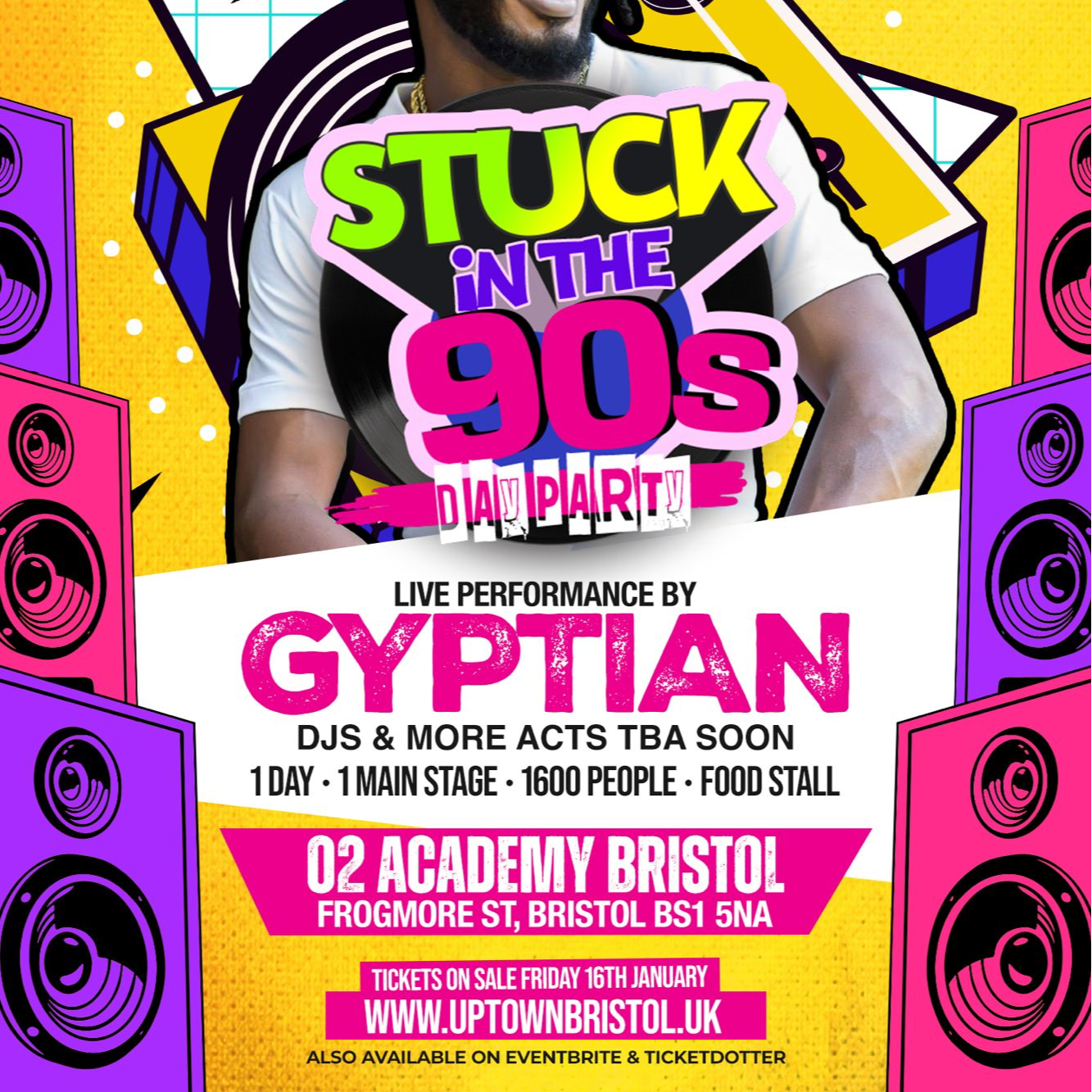 The EventSTUCK IN THE 90s – DAY PARTY ☀️🔥Bristol’s ultimate throwback day party returns this May!All your favourite old-school anthems in one place, from the 90s right through to the 2010s.Let’s take a trip down memory lane 🎶✨🗓 Sunday 24th May 2026⏰ 3:00PM – 10:00PM📍 O2 Academy BristolFrogmore St, Bristol BS1 5NA🎶 Nostalgic R&B, Hip Hop, Dancehall, Reggae, Funky House & Garage🎤 LIVE PERFORMANCE BY: REGGAE SUPERSTAR GYPTIAN 🤯🎧 BIG DJs & more acts TBAHosted by: BwoyWonder✨ 1 Day✨ 1 Main Stage✨ 1600 People✨ Food Stall🎟 Tickets available now🌐 www.uptownbristol.uk