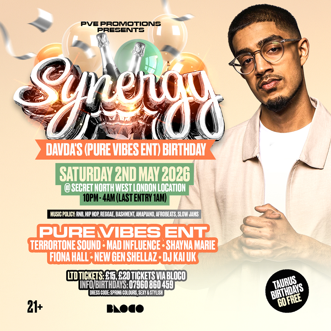The EventPVE PROMOTIONS PRESENTS ..."SYNERGY" - DAVDA'S (PURE VIBES ENT) BIRTHDAYSATURDAY 2ND MAY @ SECRET NORTH WEST LONDON LOCATION10PM - 4AM (LAST ENTRY 1AM)▬▬▬▬▬▬▬▬▬▬▬▬▬▬▬▬▬▬▬▬▬▬▬▬▬▬▬▬▬▬▬▬▬MUSIC POLICY: RNB, HIP HOP, REGGAE, DANCEHALL, AMAPIANO, AFROBEATS, SLOW JAMS★• PURE VIBES ENT★• TERRORTONE SOUND★• MAD INFLUENCE★• SHAYNA MARIE★• FIONA HALL★• NEW GEN SHELLAZ★• DJ KAI UK★• SOUND POWERED BY: VOLCANO SOUND▬▬▬▬▬▬▬▬▬▬▬▬▬▬▬▬▬▬▬▬▬▬▬▬▬▬▬▬▬▬▬▬▬LTD TICKETS: £15, £20, MTATICKET ONLY EVENT‼️ NO TICKET NO ENTRY ⛔️INFO/BIRTHDAYS: 07960 860 459DRESS CODE: SPRING COLOURS, SEXY & STYLISH (NO TRACKSUIT, NO HATS, NO HOODIES OR NO TRAINERS, DESIGNER SHOES OK) 🚫PHOTO ID, MUST BRING ID, LAST ENTRY @ 1AM